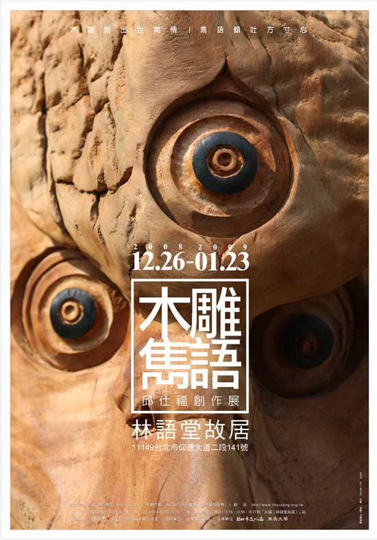 展覽時間 97年12月26(五)至98年1月23(五)展覽地點 林語堂故居參觀時間 週二至週日﹝週一休館﹞上午9:00至下午5:00參觀門票 20元主辦單位 林語堂故居、東吳大學、邱仕福木雕工作室協辦單位 台灣電力公司指導單位 台北市政府文化局、士林區公所