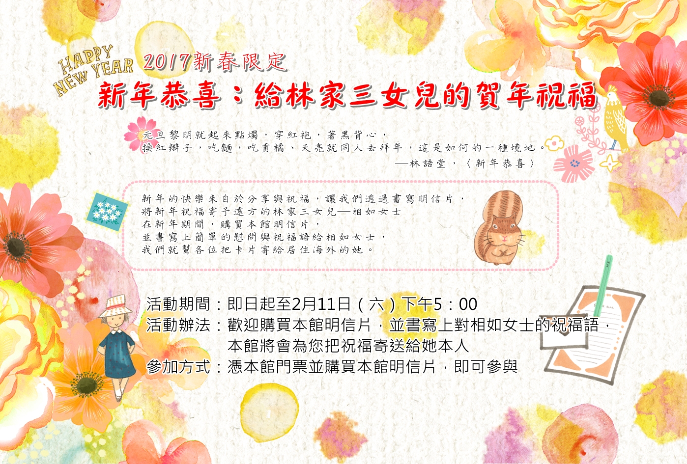 將新年祝福寄予遠方的林家三女兒─相如女士,歡迎大家在新年期間,購買本館明信片,並書寫上簡單的慰問與祝福語給相如女士,我們就會幫大家把卡片寄給居住海外的她喔。