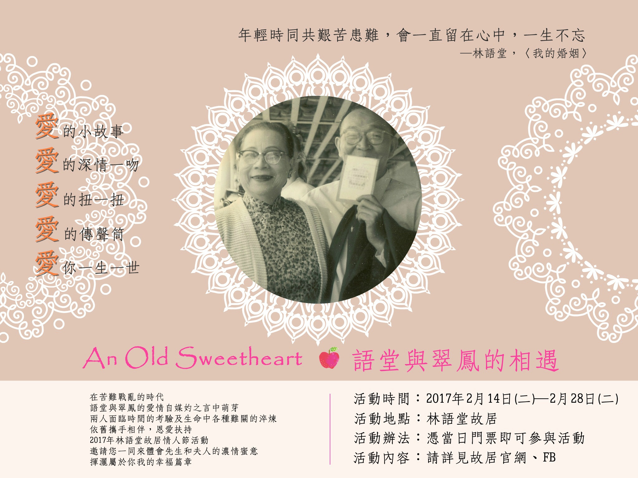 2017年情人節,林語堂故居邀請您一同追憶先生和夫人的濃情蜜意,揮灑屬於你我的幸福篇章
