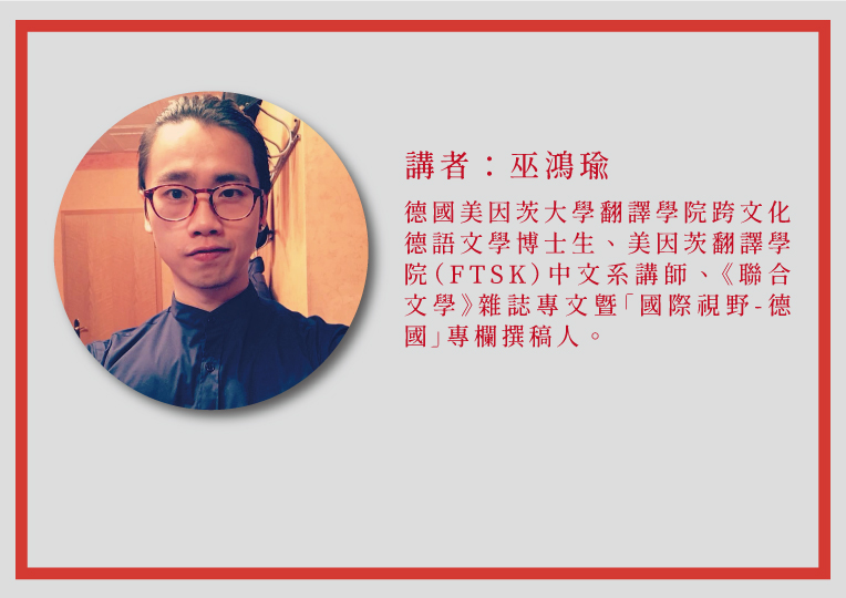 講者:巫鴻瑜德國美因茨大學翻譯學院跨文化德語文學博士生、美因茨翻譯學院(FTSK)中文系講師、《聯合文學》雜誌專文暨「國際視野-德國」專欄撰稿人。