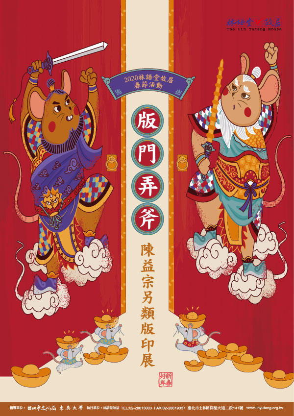 【新春特展】●版門弄斧——陳益宗另類版印展時間:109年1月7日(二)至2月9日(日)地點:林語堂故居【新春活動系列—版門弄斧玩傳藝】●迎褔春日印好運—新春版印DIY時間:1月18日(六)14:00費用:100/人主講:陳益宗 1962年生,臺科大建築所畢業。1985年開始從事傳統建築修復與研究。曾負責台中科博館「中國人的心靈生活」展示廳「萬福宮構材組裝工程」設計工程、1998年擔任文建會「國立文化資產保存研究中心」諮詢委員。著有《窗櫺、螭虎爐筆記書》、《台灣中國風現代設計精粹I》、《東方圖像榜》。