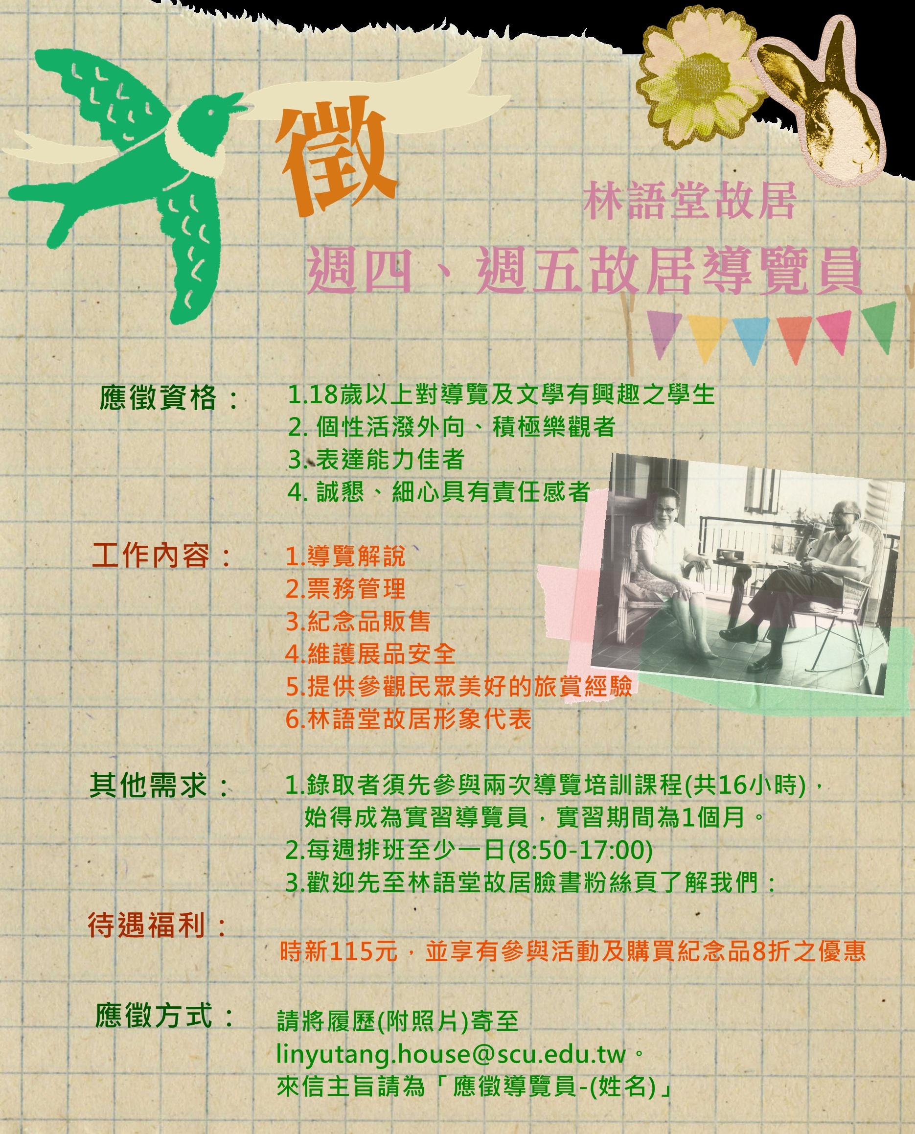 應徵資格:1. 18歲以上對導覽及文學有興趣之學生2. 個性活潑外向、積極樂觀者3. 表達能力佳者4. 誠懇、細心具有責任感者工作內容: 1.導覽解說2.票務管理3.紀念品販售4.維護展品安全5.提供參觀民眾美好的旅賞經驗6.林語堂故居形象代表待遇福利: 時新115元,並享有參與活動及購買紀念品8折之優惠專長需求: 1.親切笑容2.服務熱忱3.具求知上進之心4.好學、積極其他需求: 1.錄取者須先參與兩次導覽培訓課程(共16小時),始得成為實習導覽員,實習期間為1個月。2.每週排班至少一日(8:50-17:00)3.歡迎先至林語堂故居臉書粉絲頁了解我們:應徵方式: 請將履歷(附照片)寄至linyutang.house@scu.edu.tw。來信主旨請為「應徵導覽員-(姓名)」聯絡方式: 電話:28613003#17 林小姐linyutang.house@scu.edu.tw