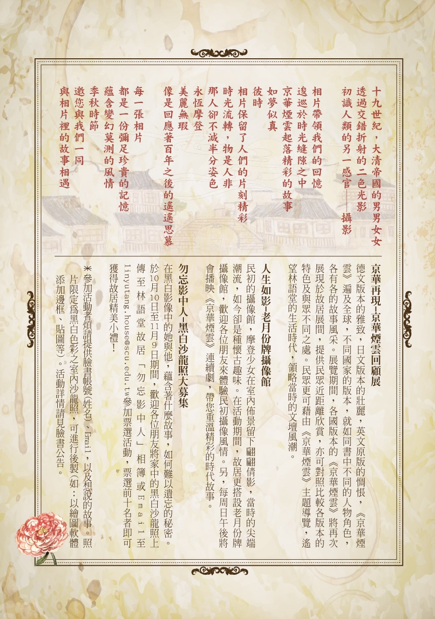 在黑白影像中的她與他,蘊含著什麼故事,如何難以遺忘的秘密。於10/10-11/9期間,歡迎各位朋友將家中的黑白沙龍照上傳至林語堂故居臉書「勿忘影中人」相簿或Email至linyutang.house@scu.edu.tw參加票選活動,票選前十名者即可獲得故居精美小禮!