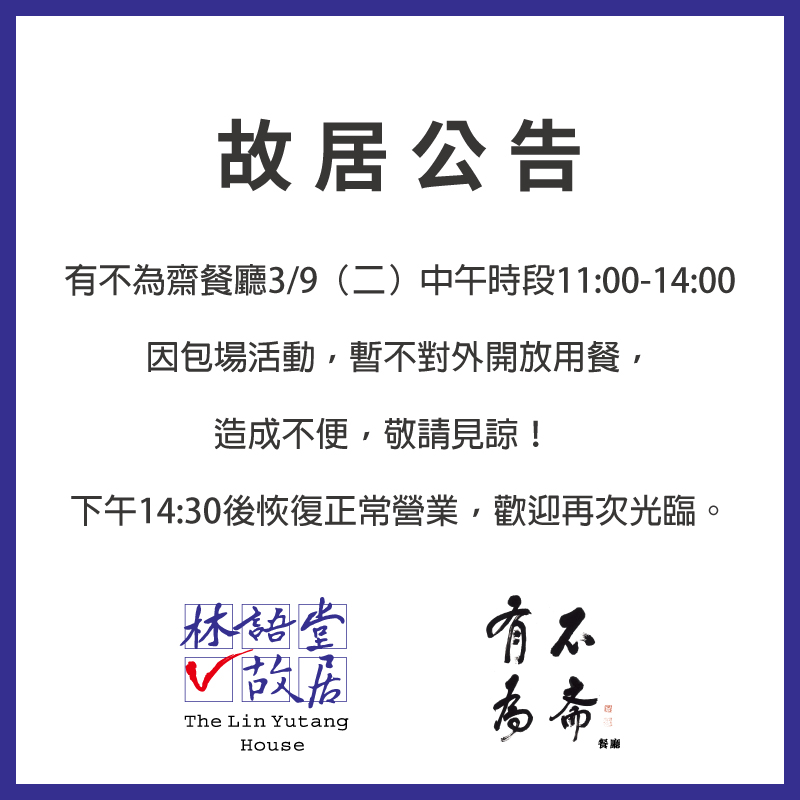 故居公告|有不為齋餐廳3/9(二)中午暫不對外供餐