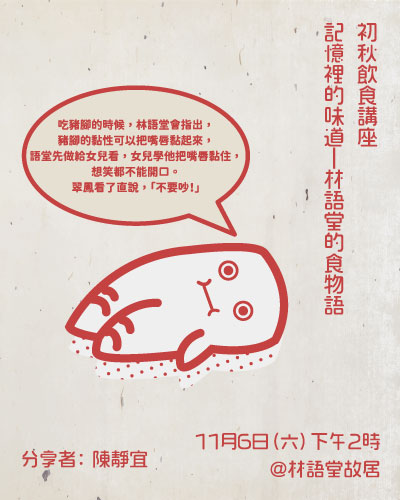 11月的初秋,林語堂故居邀請美食生活家陳靜宜。靜宜老師從事餐飲、美食報導20年,對世界各國美食以及台灣在地料理都有相當研究,將與您分享食物背後的經驗與故事