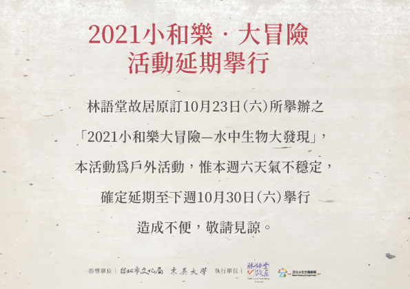 林語堂故居原訂10月23日(六)所舉辦之「2021小和樂大冒險—水中生物大發現」,