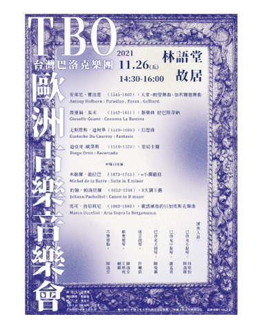 安東尼·霍伯恩(1545-1602):天堂、帕望舞曲、加利爾德舞曲。Antony Holborn : Paradizo , Pavan , Galliard.喬塞福·瓜米(1542-1611):器樂曲 拉巴斯蒂納Gioseffo Guami(1540-1611) : Conzona La Bastina尤斯塔斯·迪柯華 (1549–1609):幻想曲Eustache Du Caurroy : Fantasie迪亞哥.歐第斯(1510-1570):里切卡爾Diego Ortiz : Recercada中場15分鐘米歇爾·德拉巴(1675-1745):e小調組曲Michel de la Barre : Suite in E minor約翰·帕海貝爾(1653-1706):D大調卡農Johann Pachelbel : Canon in D major馬可·烏切利尼(1603-1680):歌謠風格的貝加馬斯克舞曲Marco Uccelini : Aria Sopra la Bergamasca.主辦單位:中國文化大學、執行單位:中國文化大學台灣巴洛克樂團、中國文化大學藝術學院、高教深耕USR計畫演奏人員:巴洛克小提琴:林欣怡、陳逸群巴洛克中提琴:謝孟蓉巴洛克大提琴:陳曼薇低音提琴:許輔宸維奧爾琴:陳逸安、王炳堯、賴頫古樂導聆:陳逸安演 出 人:徐興慶執行製作:樊慰慈秘 書:郭亮玎工作人員:周葛昀、郭賢齊