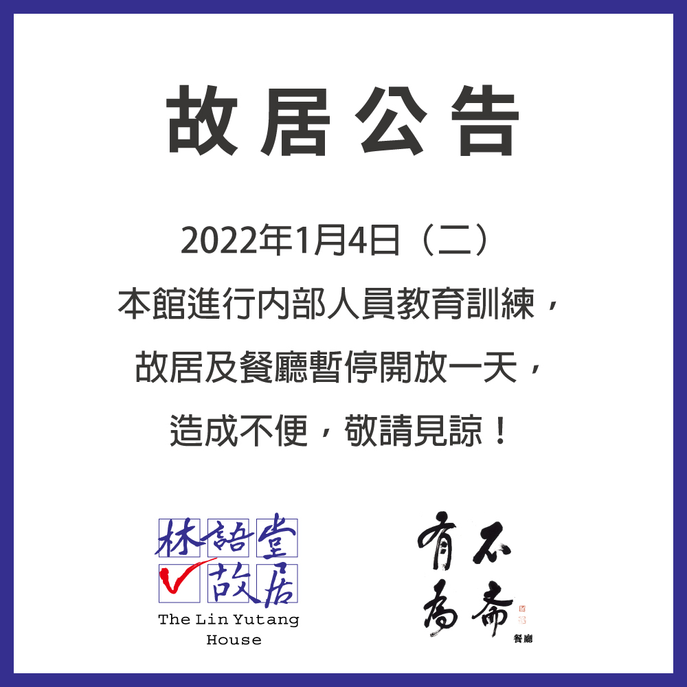 2022年1月4日(二)本館進行內部人員教育訓練,故居及餐廳暫停開放一天,造成不便,敬請見諒!