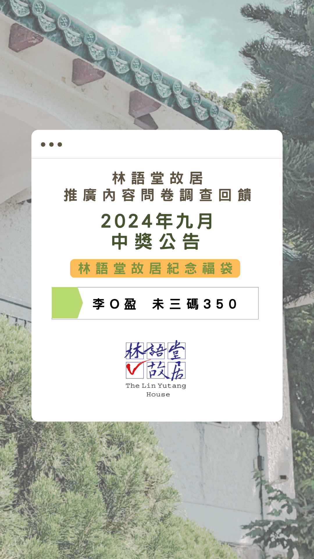 🎉林語堂故居推廣內容問卷調查回饋中獎公告