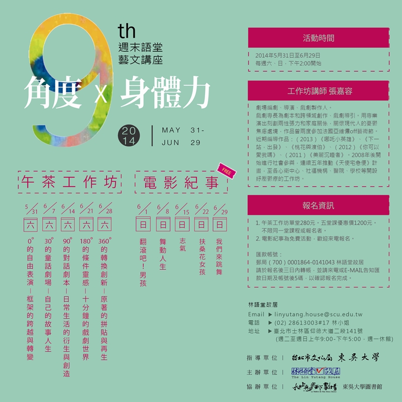 緩緩將雙肩向後旋轉,伸展肢臂移動腳步再放下,就可感覺身體支持著我們生活中的一舉一動。奔跑、漫遊、沉思、吟唱,開與闔、動與靜、緩與急,透過身體變化不同的角度,不斷累積生活的學習。透過肢體,不單感知外在物質世界,也可觸及內在靈性生活。語堂先生曾說:「我們對於身體上的神祕和美麗,愈久愈有深刻的印象。使我們不能不感到我們身體內的各部動作,以及彼此間的微妙聯繫是在極端困難的情形下所做成的,而其結果又是那麼簡單,始終不變。」報名資訊| 1. 午茶工作坊單堂280元。五堂課優惠價1200元。不限同一堂課程或報名者。2. 電影紀事為免費活動,歡迎來電報名。3.報名網址:https://docs.google.com/forms/d/19_AwSDyiwpCUb4beepP9e43THavNaCZpD8LTZXXUTRU/viewform匯款帳號:郵局(700)0001864-0141043 林語堂故居請於報名後三日內轉帳,並請來電或E-MAIL告知匯款日期及帳號後5碼,以確認報名完成。如有任何問題,歡迎來電洽詢!(週二至週日上午9:00-下午5:00,周一休館)Email:linyutang.house@scu.edu.tw電話:(02) 28613003#17 林小姐指導單位:台北市文化局 Soochow University主辦單位: 林語堂故居協辦單位: 水面上與水面下劇團 Le Théâtre de l'Eau Dessus Dessous 東吳大學圖書館Soochow University Library