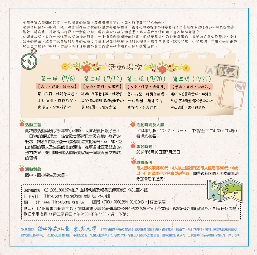 林語堂故居,身為一代作家故居的標的館舍,一本傳承和樂精神的初衷,同時響應先生對於新奇事物、美景的好奇心與藝術、文化品味的執著,結合了歐美風行多年的藝術文化巴士與在地城市小旅行的理念。在今年暑假,讓大朋友、小朋友們,不用忍受舟車勞頓之苦也能就地取材,認識我們生活週遭的藝文館舍和欣賞精彩可期的展覽活動。